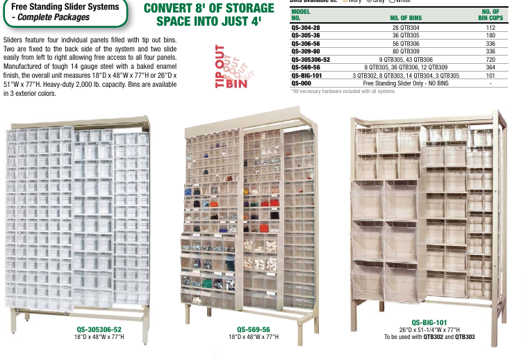 - System comes complete with (36) QTB-305 Tip-Out Bins (180 total bin cups).