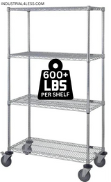 Mobile wire shelving units are perfect for all mobile storage requirements. Wire shelving units with wheels are available in all finishes, including chrome, black epoxy, green epoxy, gray epoxy and stainless steel. Each mobile shelving unit has a 1200 lb. capacity. The mobile kit consists of 4 swivel casters, 2 casters with brakes.